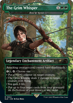 Attacking creatures you control have deathtouch. {1}{G}, {T}: Choose one — • Put a +1/+1 counter on target creature. • Bow of Nylea deals 2 damage to target creature with flying. • You gain 3 life. • Put up to four target cards from your graveyard on the bottom of your library in any order.