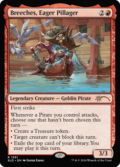 First strike Whenever a Pirate you control attacks, choose one that hasn't been chosen this turn — • Create a Treasure token. • Target creature can't block this turn. • Exile the top card of your library. You may play it this turn.