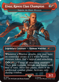 Whenever a Warrior attacks, you may have its controller create a 1/1 white Warrior creature token that's tapped and attacking. {W}{U}{B}{R}{G}: Untap all attacking creatures. They gain trample, lifelink, and haste until end of turn. After this phase, there is an additional combat phase. Activate only during combat.