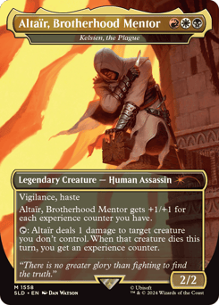 Vigilance, haste Kelsien gets +1/+1 for each experience counter you have. {T}: Kelsien deals 1 damage to target creature you don't control. When that creature dies this turn, you get an experience counter.