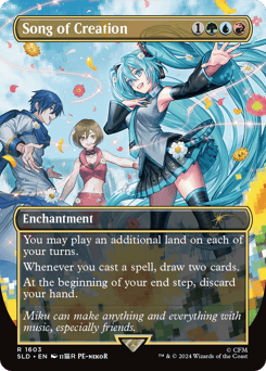Flying, haste Whenever a creature you control with flying and/or haste attacks, you get 20% cooler. (You start at 0% coolness.) Sonic Rainboom — {T}: If you're at least 100% cool, add {W}{U}{B}{R}{G}, draw a card, and reset your coolness.