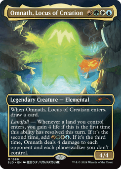 When Omnath enters, draw a card. Landfall — Whenever a land you control enters, you gain 4 life if this is the first time this ability has resolved this turn. If it's the second time, add {R}{G}{W}{U}. If it's the third time, Omnath deals 4 damage to each opponent and each planeswalker you don't control.
