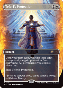 Until your next turn, your life total can't change and you gain protection from everything. All permanents you control phase out. (While they're phased out, they're treated as though they don't exist. They phase in before you untap during your untap step.) Exile Teferi's Protection.