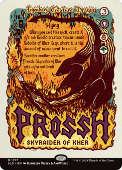When you cast this spell, create X 0/1 red Kobold creature tokens named Kobolds of Kher Keep, where X is the amount of mana spent to cast it. Flying Sacrifice another creature: Prossh gets +1/+0 until end of turn.