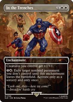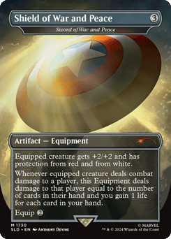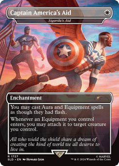 Throw ... — {3}, Unattach an Equipment from Captain America: He deals damage equal to that Equipment's mana value divided as you choose among one, two, or three targets. ... Catch — At the beginning of combat on your turn, attach up to one target Equipment you control to Captain America.