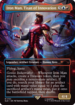 Flying, haste Genius Industrialist — Whenever Iron Man attacks, create a Treasure token, then you may sacrifice a noncreature artifact. If you do, search your library for an artifact card with mana value equal to 1 plus the sacrificed artifact's mana value, put it onto the battlefield tapped, then shuffle.