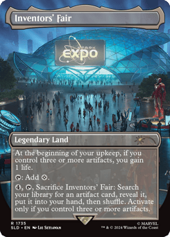 At the beginning of your upkeep, if you control three or more artifacts, you gain 1 life. {T}: Add {C}. {4}, {T}, Sacrifice Inventors' Fair: Search your library for an artifact card, reveal it, put it into your hand, then shuffle. Activate only if you control three or more artifacts.