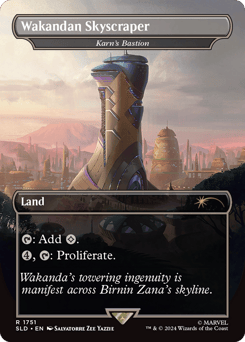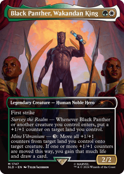 First strike Survey the Realm — Whenever Black Panther or another creature you control enters, put a +1/+1 counter on target land you control. Mine Vibranium — {3}: Move all +1/+1 counters from target land you control onto target creature. If one or more +1/+1 counters are moved this way, you gain that much life and draw a card.