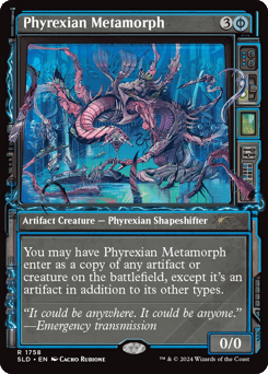 ({U/P} can be paid with either {U} or 2 life.) You may have this creature enter as a copy of any artifact or creature on the battlefield, except it's an artifact in addition to its other types.