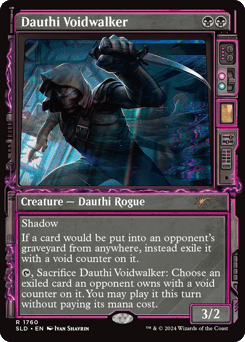 Shadow (This creature can block or be blocked by only creatures with shadow.) If a card would be put into an opponent's graveyard from anywhere, instead exile it with a void counter on it. {T}, Sacrifice this creature: Choose an exiled card an opponent owns with a void counter on it. You may play it this turn without paying its mana cost.