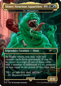 As The Mimeoplasm enters, you may exile two creature cards from graveyards. If you do, it enters as a copy of one of those cards with a number of additional +1/+1 counters on it equal to the power of the other card.