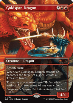 Other Dwarves you control get +1/+0. Whenever a Dwarf you control becomes tapped, create a Treasure token. Sacrifice five Treasures: Search your library for an artifact or Dragon card, put that card onto the battlefield, then shuffle.