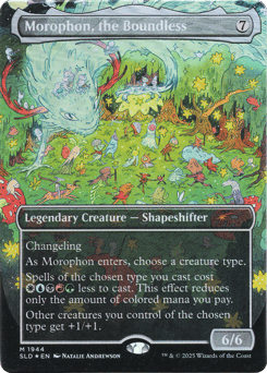 Changeling (This card is every creature type.) As Morophon enters, choose a creature type. Spells of the chosen type you cast cost {W}{U}{B}{R}{G} less to cast. This effect reduces only the amount of colored mana you pay. Other creatures you control of the chosen type get +1/+1.