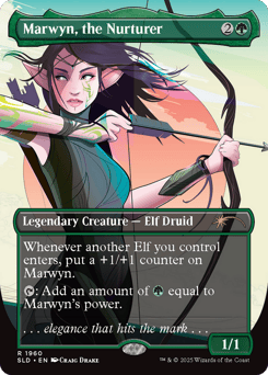Whenever another Elf you control enters, put a +1/+1 counter on Marwyn. {T}: Add an amount of {G} equal to Marwyn's power.