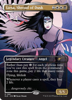 Rather than pay {2} for each previous time you've cast this spell from the command zone this game, pay 2 life that many times. Flying, lifelink Whenever a player casts a spell, they lose 2 life.