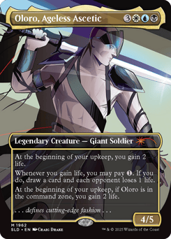 At the beginning of your upkeep, you gain 2 life. Whenever you gain life, you may pay {1}. If you do, draw a card and each opponent loses 1 life. At the beginning of your upkeep, if Oloro is in the command zone, you gain 2 life.
