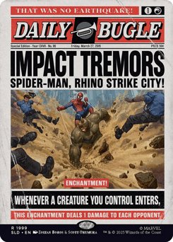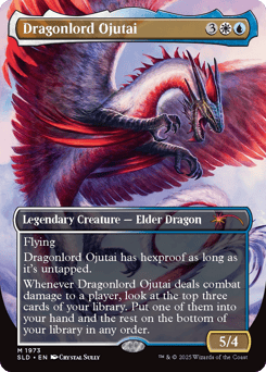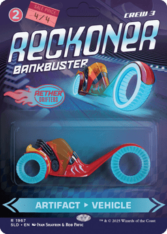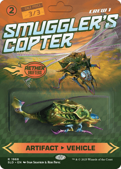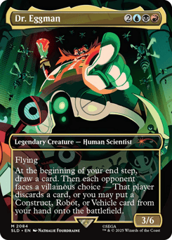 Flying At the beginning of your end step, draw a card. Then each opponent faces a villainous choice — That player discards a card, or you may put a Construct, Robot, or Vehicle card from your hand onto the battlefield.