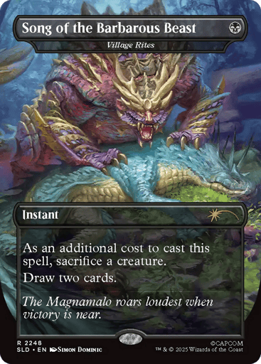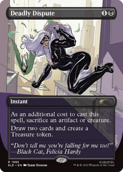 As an additional cost to cast this spell, sacrifice an artifact or creature. Draw two cards and create a Treasure token. (It's an artifact with "{T}, Sacrifice this token: Add one mana of any color.")