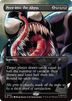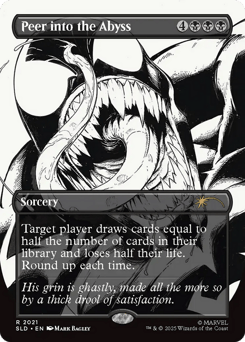 Target player draws cards equal to half the number of cards in their library and loses half their life. Round up each time.