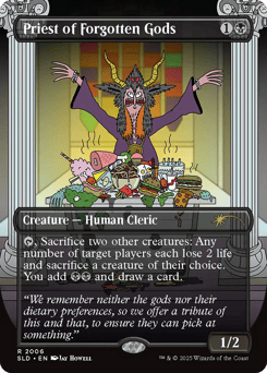 {T}, Sacrifice two other creatures: Any number of target players each lose 2 life and sacrifice a creature of their choice. You add {B}{B} and draw a card.