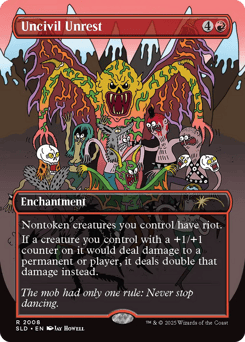 Nontoken creatures you control have riot. (They enter with your choice of a +1/+1 counter or haste.) If a creature you control with a +1/+1 counter on it would deal damage to a permanent or player, it deals double that damage instead.