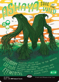 Ashaya's power and toughness are each equal to the number of lands you control. Nontoken creatures you control are Forest lands in addition to their other types. (They're still affected by summoning sickness.)