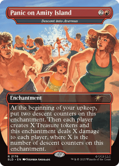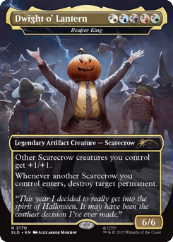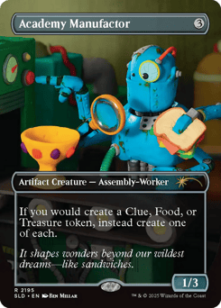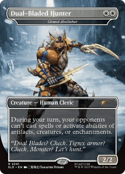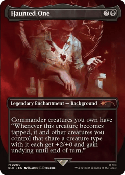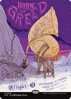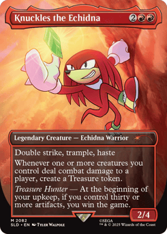 Double strike, trample, haste Whenever one or more creatures you control deal combat damage to a player, create a Treasure token. Treasure Hunter — At the beginning of your upkeep, if you control thirty or more artifacts, you win the game.