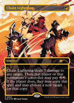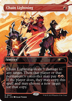 Chain Lightning deals 3 damage to any target. Then that player or that permanent's controller may pay {R}{R}. If the player does, they may copy this spell and may choose a new target for that copy.