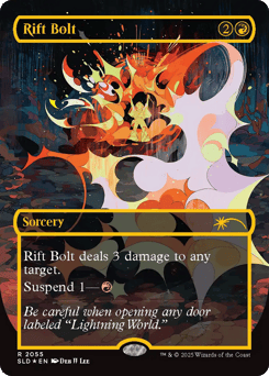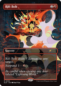 Rift Bolt deals 3 damage to any target. Suspend 1—{R} (Rather than cast this card from your hand, you may pay {R} and exile it with a time counter on it. At the beginning of your upkeep, remove a time counter. When the last is removed, you may cast it without paying its mana cost.)