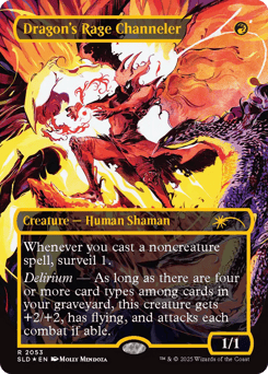 Whenever you cast a noncreature spell, surveil 1. (Look at the top card of your library. You may put that card into your graveyard.) Delirium — As long as there are four or more card types among cards in your graveyard, this creature gets +2/+2, has flying, and attacks each combat if able.