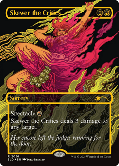 Spectacle {R} (You may cast this spell for its spectacle cost rather than its mana cost if an opponent lost life this turn.) Skewer the Critics deals 3 damage to any target.