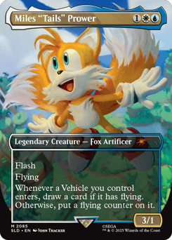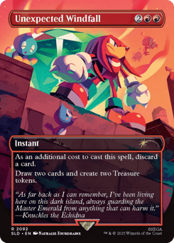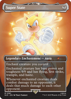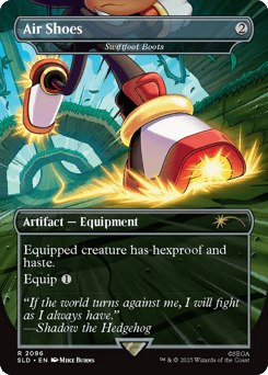 Haste Gotta Go Fast — Whenever Sonic the Hedgehog attacks, put a +1/+1 counter on each creature you control with flash or haste. Whenever a creature you control with flash or haste is dealt damage, create a tapped Treasure token.