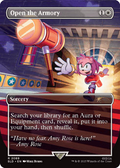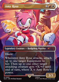 Haste Whenever Amy Rose attacks, attach up to one target Equipment to her. Then up to one other target attacking creature gets +X/+0 until end of turn, where X is Amy Rose's power.