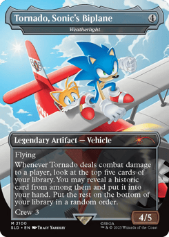 Flying Whenever Weatherlight deals combat damage to a player, look at the top five cards of your library. You may reveal a historic card from among them and put it into your hand. Put the rest on the bottom of your library in a random order. (Artifacts, legendaries, and Sagas are historic.) Crew 3