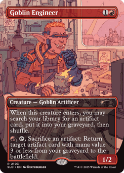 When this creature enters, you may search your library for an artifact card, put it into your graveyard, then shuffle. {R}, {T}, Sacrifice an artifact: Return target artifact card with mana value 3 or less from your graveyard to the battlefield.