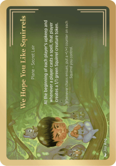 At the beginning of each player's upkeep and whenever a player casts a spell, that player creates a 1/1 green Squirrel creature token. Whenever chaos ensues, put a +1/+1 counter on each Squirrel you control.
