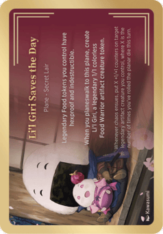 Legendary Food tokens you control have hexproof and indestructible. When you planeswalk to this plane, create Li'l Giri, a legendary 1/1 colorless Food Warrior artifact creature token. Whenever chaos ensues, put X+1/+1 counters on target legendary artifact creature you control, where X is the number of times you've rolled the planar die this turn.