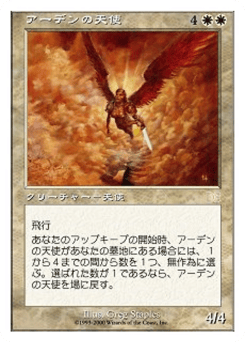 Flying At the beginning of your upkeep, if Arden Angel is in your graveyard, roll a four-sided die. If the result is 1, return Arden Angel from your graveyard to the battlefield.