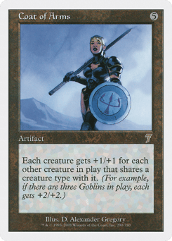 Each creature gets +1/+1 for each other creature on the battlefield that shares at least one creature type with it. (For example, if two Goblin Warriors and a Goblin Shaman are on the battlefield, each gets +2/+2.)