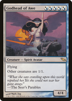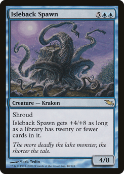Shroud (This creature can't be the target of spells or abilities.) This creature gets +4/+8 as long as a library has twenty or fewer cards in it.