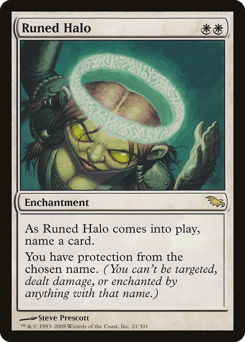 As this enchantment enters, choose a card name. You have protection from the chosen card name. (You can't be targeted, dealt damage, or enchanted by anything with that name.)