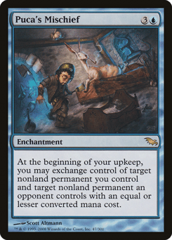 At the beginning of your upkeep, you may exchange control of target nonland permanent you control and target nonland permanent an opponent controls with equal or lesser mana value.