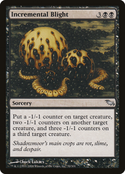 Put a -1/-1 counter on target creature, two -1/-1 counters on another target creature, and three -1/-1 counters on a third target creature.