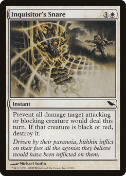 Prevent all damage target attacking or blocking creature would deal this turn. If that creature is black or red, destroy it.