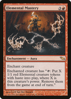 Enchant creature Enchanted creature has "{T}: Create X 1/1 red Elemental creature tokens with haste, where X is this creature's power. Exile them at the beginning of the next end step."
