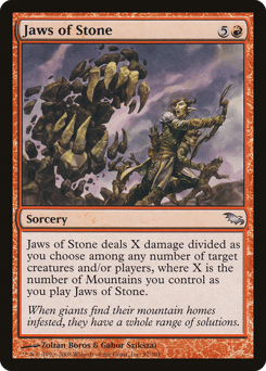 Jaws of Stone deals X damage divided as you choose among any number of targets, where X is the number of Mountains you control as you cast this spell.