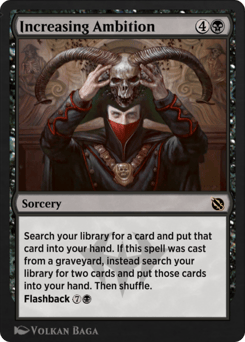 Search your library for a card and put that card into your hand. If this spell was cast from a graveyard, instead search your library for two cards and put those cards into your hand. Then shuffle. Flashback {7}{B} (You may cast this card from your graveyard for its flashback cost. Then exile it.)