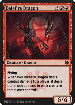 Flying Whenever this creature deals combat damage to a player, it deals that much damage to each creature that player controls.