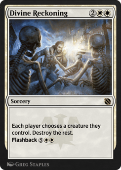Each player chooses a creature they control. Destroy the rest. Flashback {5}{W}{W} (You may cast this card from your graveyard for its flashback cost. Then exile it.)