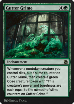 Whenever a nontoken creature you control dies, put a slime counter on this enchantment, then create a green Ooze creature token with "This token's power and toughness are each equal to the number of slime counters on Gutter Grime."